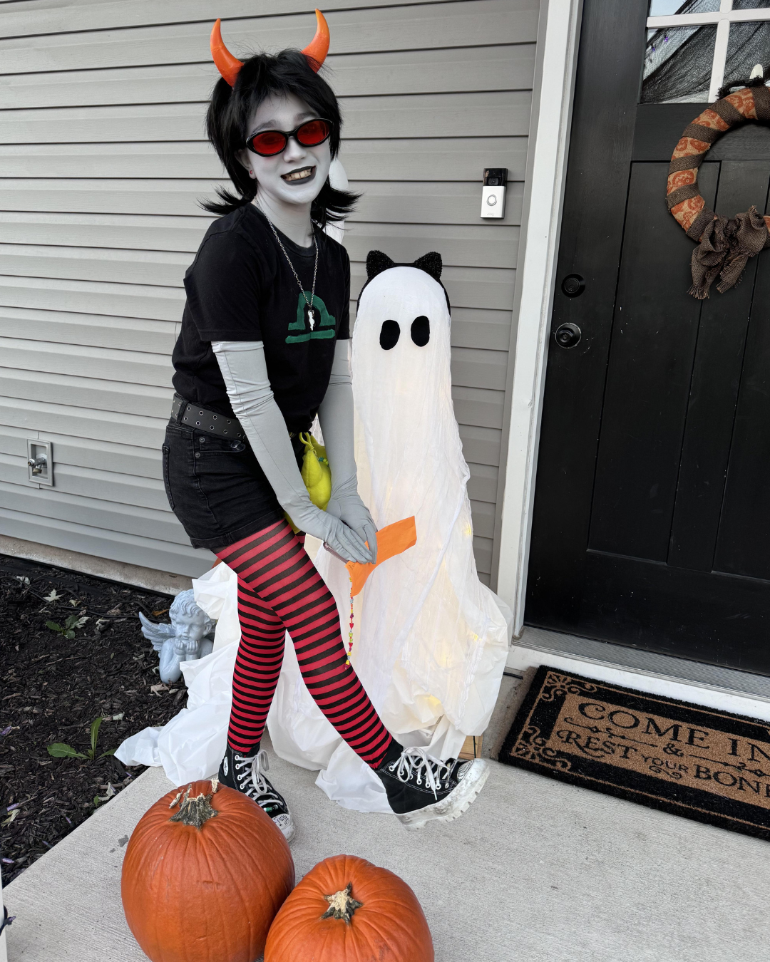 This look masterfully embodies a Homestuck Troll, complete with the character’s signature gray skin, bright red horns, and striking red-and-black striped stockings.