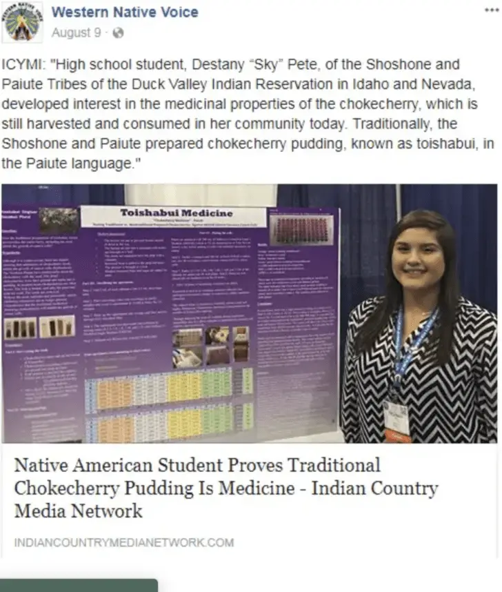 Occasionally, unexpected sources can offer definitive proof of a plant’s medicinal value. One such instance involves a traditional recipe and plant that gained recognition through the efforts of a high school Native American student at the International Science Fair in Los Angeles. According to Indian Country Today, Destany “Sky” Pete, a member of the Shoshone and Paiute Tribes from the Duck Valley Indian Reservation in Idaho and Nevada, discovered that her tribe’s current health issues were linked to a lack of traditional foods, including the forgotten recipe for toishabui, or chokecherry pudding.