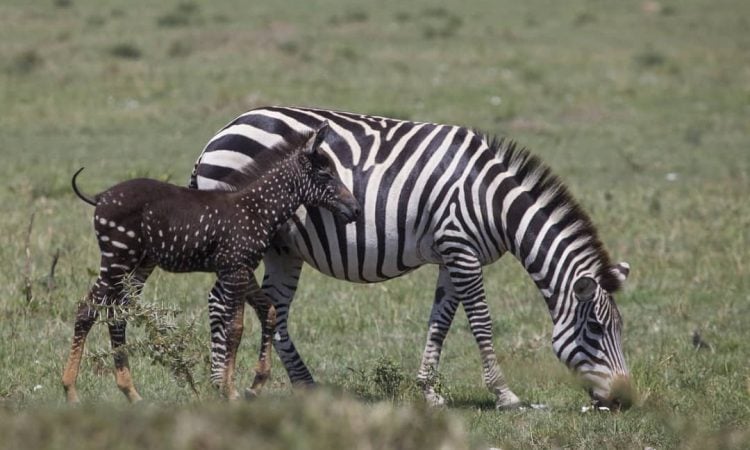 The polka-dotted foal’s condition, known scientifically as “pseudo-leucism,” occurs when pigment-producing cells develop unevenly. Unlike albino animals, these zebras still have some of their natural coloration, but the lines break into isolated spots.