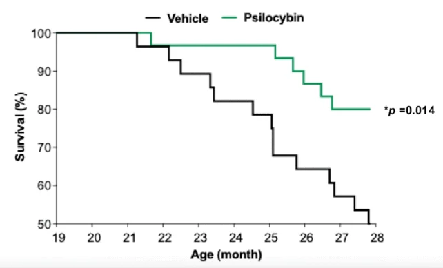 The second phase of the study tested psilocybin’s effects on live animals, particularly mice. For the experiment, female mice aged 19 months—roughly the equivalent of 60-65 years in human terms—were given monthly doses of psilocybin. After a 10-month treatment period, the results were striking: 80% of the mice that received psilocybin were still alive, compared to only 50% of the control group. The treated mice also showed fewer signs of aging, such as better fur quality and fewer white hairs, though aging signs were not studied in-depth.