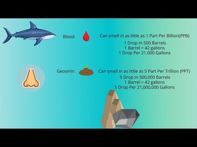 When scientists compare human sensitivity to geosmin with sharks’ sensitivity to blood, they are comparing thresholds of detection — and in that comparison, humans outperform sharks.